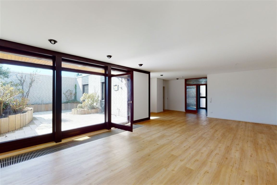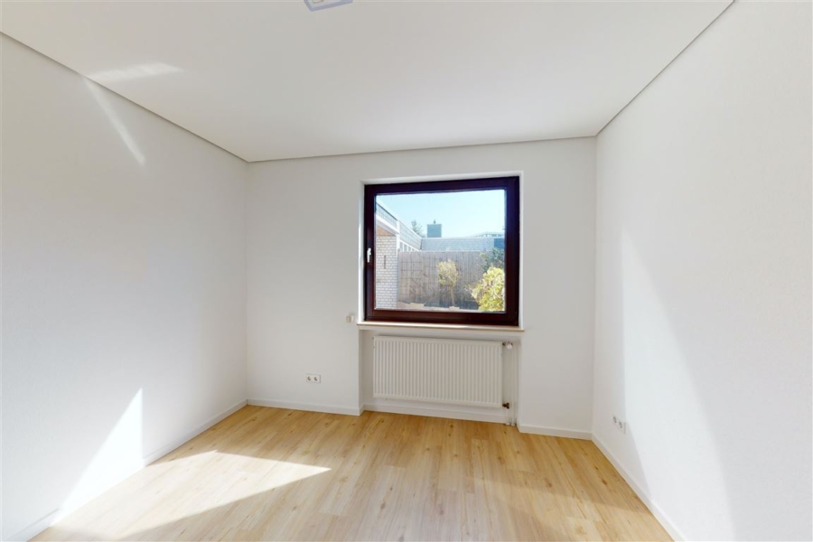 Ausgehend vom Eingangs- und Flurbereich sind alle Räume der Ebene zu erreichen. Das Wohnzimmer stellt den Mittelpunkt der Ebene dar und bietet Zugang zum süd-westlich ausgerichteten, nicht einsehbaren Gartenhof. Von hier aus lassen sich entspannte Sonnenstunden und Grillabende im Freien verbringen. Eine installierte elektrische Marquise sorgt für den nötigen Sonnenschutz. Sei es zur Nutzung als Schlafzimmer, als Kinderzimmer oder als heimisches Büro – der praktische Zuschnitt der drei weiteren Räume ermöglicht unkompliziertes Einrichten und die Umsetzung der eigenen Raumvorstellung. Das gesamte Wohngeschoss ist mit einheitlichem Laminatboden und weißen Fußbodenleisten ausgestattet, die Wände sind modern verputzt. Die Fenster sind zudem mit elektrischen Rollläden versehen.