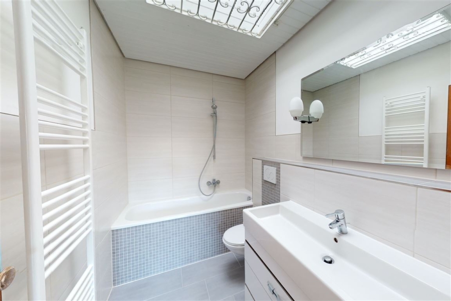 Der separate Küchenraum kann aufgrund seines rechteckigen Zuschnittes unkompliziert mit einer geräumigen Küchenzeile ausgestattet werden. Während eines der Tageslichtbadezimmer neben WC, Waschbereich und Handtuchheizkörper mit einer bodentiefen Dusche ausgestattet ist, verfügt zweite Badezimmer über eine Wanne. Sämtliche Räumlichkeiten, so auch die Badezimmer, wurden in den vergangenen Jahren modernisiert.
