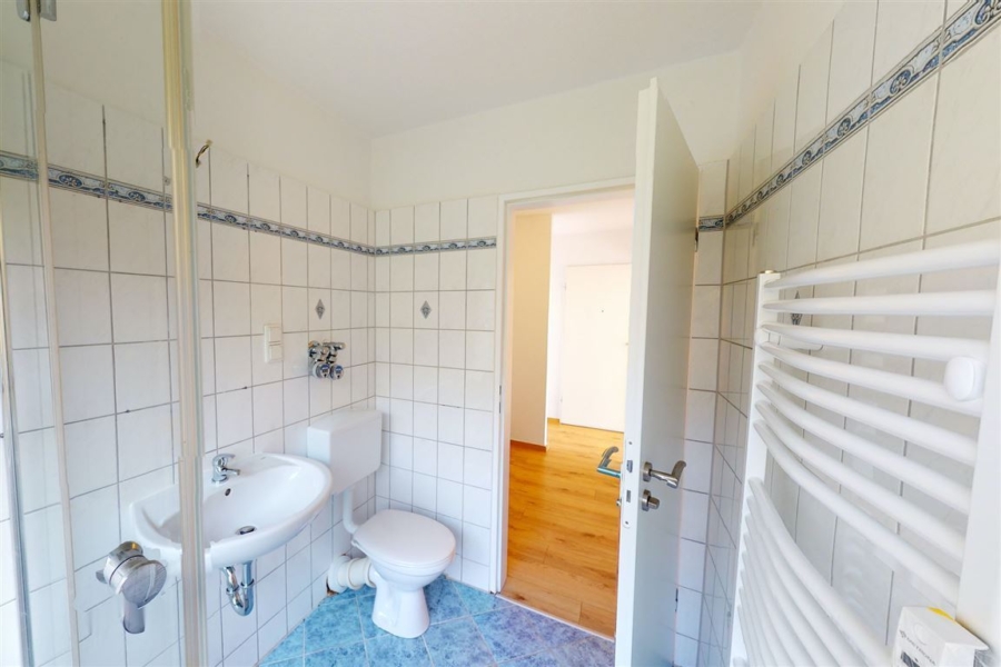 Der einheitliche Laminatboden verleiht der Wohnung einen modernen, hochwertigen Charakter und sorgt für ein ganzheitliches Erscheinungsbild. Der separate und mit Fliesenspiegel versehene Küchenraum ist mit einer vollwertigen Einbauküche versehen, diese ist im Kaufpreis inbegriffen. Neben gängigen Elektrogeräten wie Herd, Ofen und Geschirrspüler bieten diverse Schubladen und Schränke ausreichend Stauraum für Küchenutensilien. Das Tageslichtbadezimmer ist neben einem WC und einem Waschbereich mit einer Dusche sowie einem Handtuchheizkörper ausgestattet. Weiterhin lässt sich im Badezimmer eine Waschmaschine anschließen.