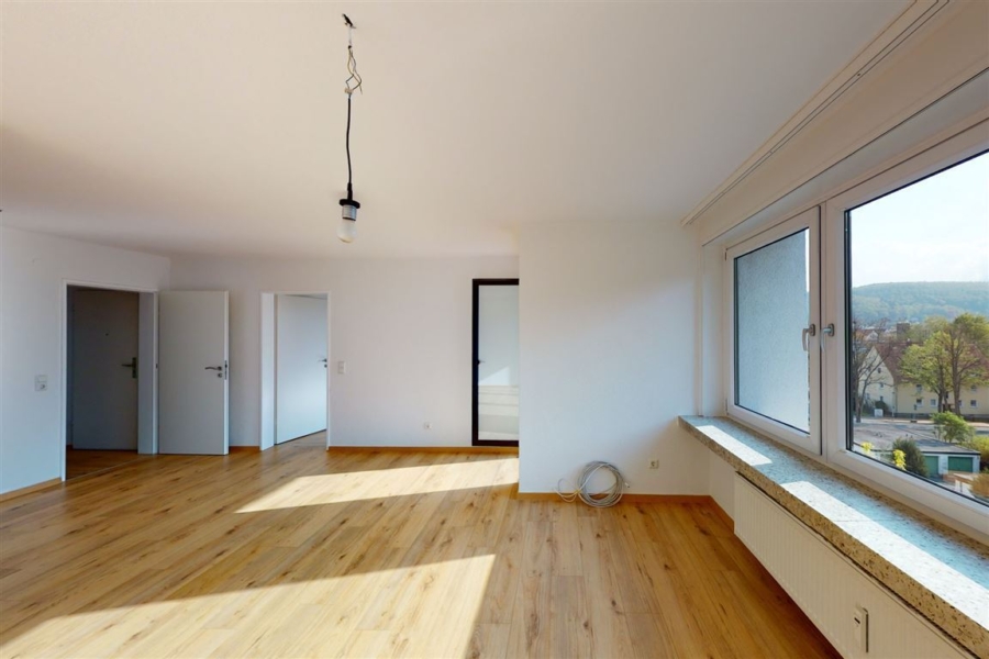 Ausgehend vom Flur und Eingangsbereich sind der offene Wohn- und Essbereich, die Küche sowie das Badezimmer zu erreichen. Die angenehme Zimmeraufteilung und der praktische Zuschnitt ermöglichen unkompliziertes Einrichten und die Umsetzung der eigenen Raumvorstellung. Mit rund 12 m² bietet das Schlafzimmer ausreichend Fläche für ein großzügiges Bett sowie einen geräumigen Kleiderschrank. Der knapp 27 m² große Wohnbereich ermöglicht neben der Unterbringung einer großen Sofa-Garnitur zusätzlich die Einrichtung eines Essbereiches. Zudem bietet sowohl das Wohnzimmer, als auch das Schlafzimmer Zugang zum westlich ausgerichteten Balkon. Von hier aus lassen sich mit dem Blick über Bad Harzburg und die umliegenden Höhen entspannte Sonnenstunden und Abende im Freien verbringen.
