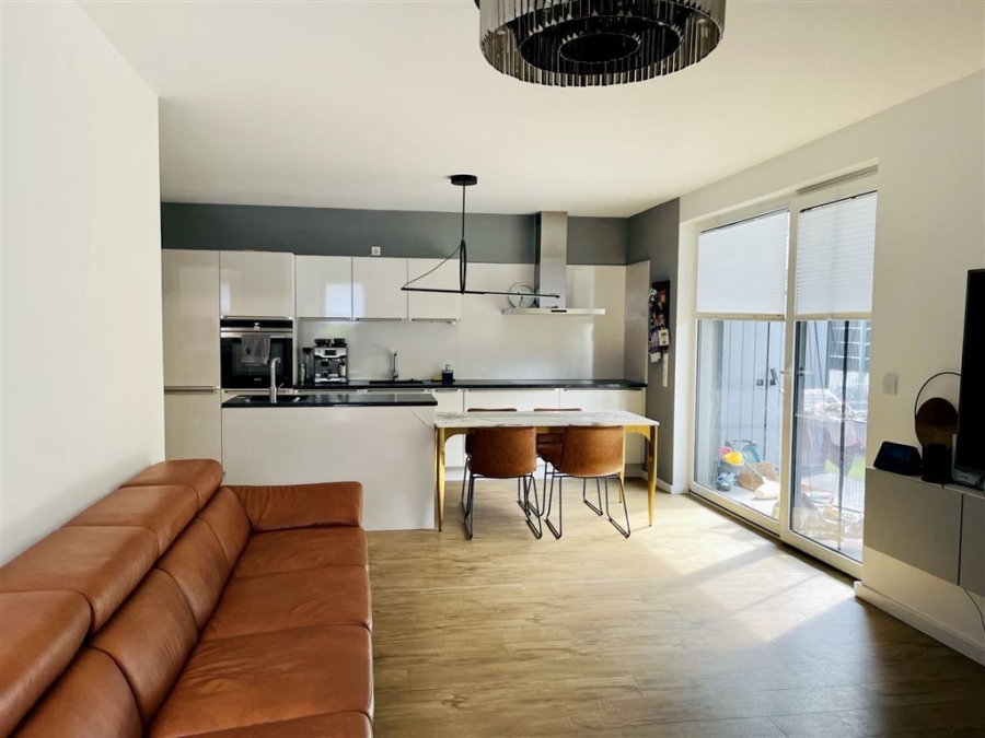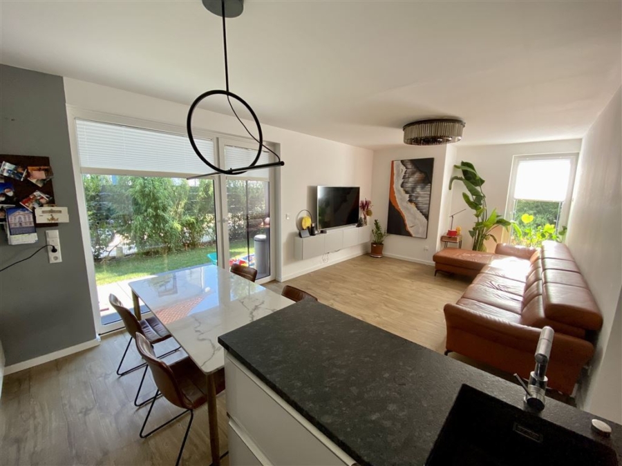 Ausgehend vom Eingangsbereich eröffnet sich der großzügige Wohn- und Essbereich, welcher den Mittelpunkt der Wohnung darstellt. Daran anknüpfend erschließt sich die offene Küche, diese ist mit einer hochwertigen Einbauküche ausgestattet und im Mietzins inbegriffen. Neben gängigen Elektrogeräten wie Herd, Ofen und Geschirrspüler bieten zahlreiche Schränke und Schubladen ausreichend Stauraum für die Unterbringung diverser Küchenutensilien. Darüber hinaus bietet das Wohnzimmer Zugang zum Terrassenbereich, welcher zu gemütlichen Sonnenstunden und Abenden im Garten einlädt. Ausgehend vom Flurbereich sind zudem alle weiteren Räume wie das Tageslichtbadezimmer, das Gäste-WC, sowie die drei weiteren Zimmer erreichbar.